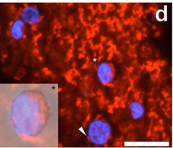 The blue colour is DAPI staining of nuclei of THP1 cells ( a model of the type of monocytes known to invade the vaccine injection site). The bright orange is aluminium adjuvant though more specifically it is an indicator of the availability of the acutely toxic free metal cation Al3+. It is a visual representation of how much cytotoxic Al3+ is available in the vicinity of the injection site to produce a significant inflammatory response. It is this inflammatory response that is key. It initiates a cascade of invading immune reactive cells to the vaccine injection site. It is recognition that aluminium adjuvant is also ‘foreign matter’ and must be dealt with by the various defence mechanisms of the body. Many of the invading cells are phagocytic, such as macrophages, and they ‘eat’ the particles of aluminium adjuvant accumulating it in membrane bound vesicles within their cytoplasm. By chance some of these particle may also have antigen associated with them. Indeed these phagocytes infiltrating the vaccine injection site will also take up any free antigen they encounter. Their role is to ‘neutralise’ any foreign substance that they come across at the vaccine injection site. Some of these cells will carry their cargoes to the lymph nodes where antigens and aluminium alike will be processed and an immune response initiated. Antibodies will be raised against not only the vaccine antigen but also against aluminium. The former, antibodies against the antigen, form the basis for the vaccine and these are measured by vaccine manufacturers as an indication of the effectiveness of the vaccine. The latter, antibodies against aluminium, are not measured. Indeed they are not even considered as consequential.