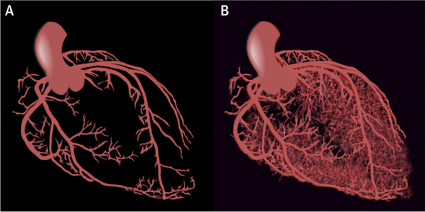 On the left (A) is an image of the heart’s blood supply (coronary circulation) when the body and consequently the heart is at rest. While on the right (B) we have an example of what the coronary circulation might look like when you are being chased by someone with a large axe. The Tin Man?