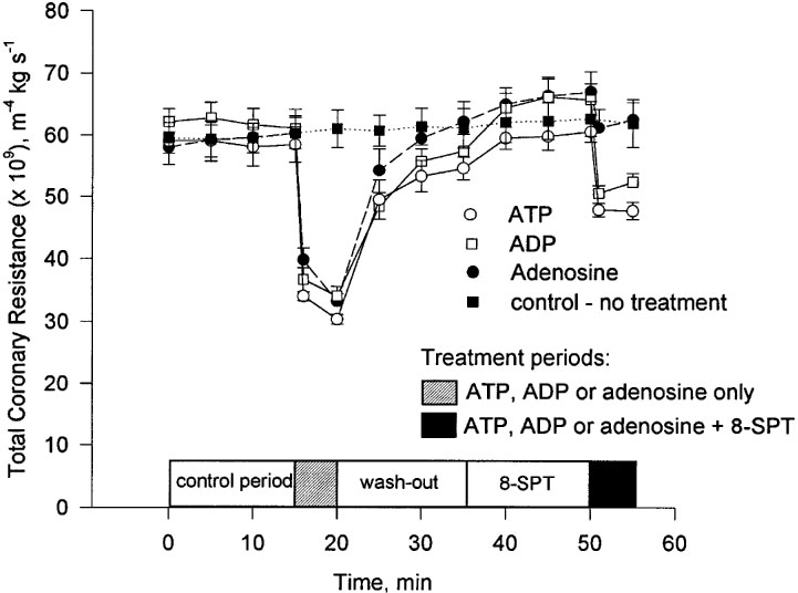 The figure shows that when the activity of adenosine is blocked using the pharmacological agent 8-SPT approximately half of the vasodilatory effect remains.