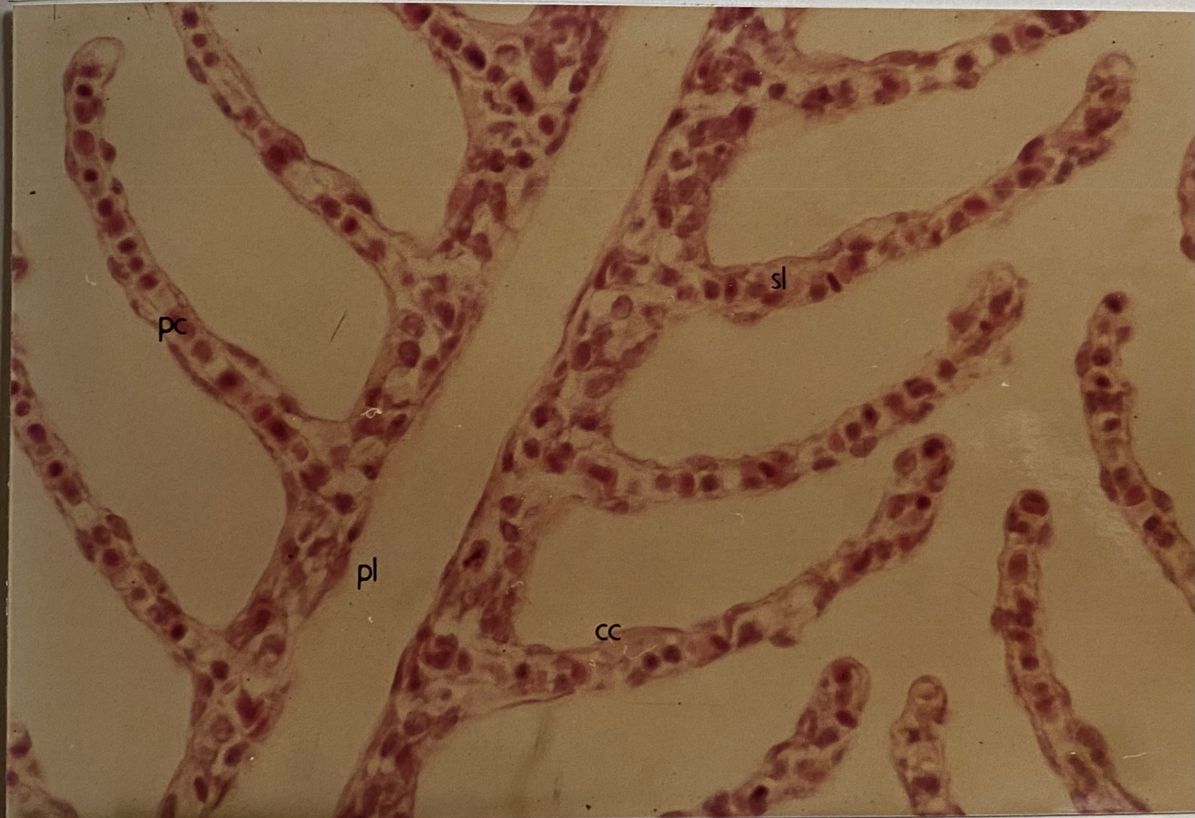 Some explanation is required. The photograph is a light microscopy image of the fine structure of a fish gill. It is composed of primary lamellae (pl) and secondary lamellae (sl) creating a vast surface area over which water flows and gases and ions can be exchanged. This image also shows chloride cells (cc) and these allow anadromous fish such as salmon to pass between fresh and seawater and vice versa.