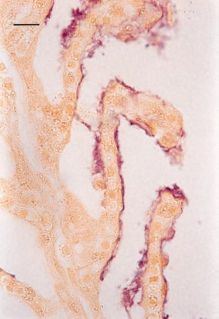 The fact that the gill boundary layer remains at circumneutral pH even when the bulk water pH falls below pH 5.0 explains why mild acidity per se is not toxic in fish. However, bulk water at pH 5.0 that also includes 200ppb total aluminium is acutely toxic within 24-48h. The exact mechanism of acute aluminium toxicity under these conditions is explained in detail in the aforementioned paper but in brief the actions of aluminium, acting through Al3+, disrupts the integrity of the gbl and binds at functional groups at the gill surface. These actions of aluminium are shown in the image below, aluminium is stained purple.
