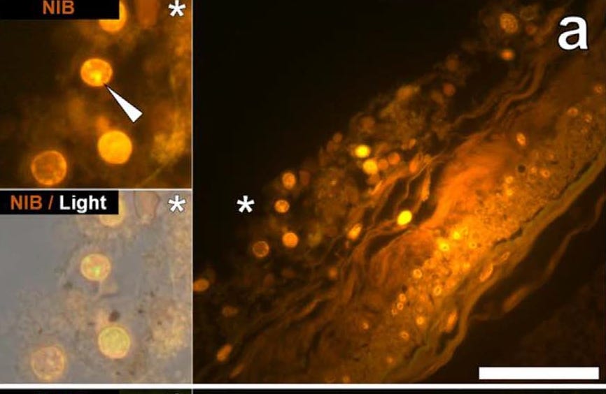 The large image on the left shows a significant deposit of aluminium (yellow/orange fluorescence) in brain tissue and in close proximity to the inflamed tissue, see asterisk, are microglial cells loaded with aluminium. These are shown magnified to the right of the image.