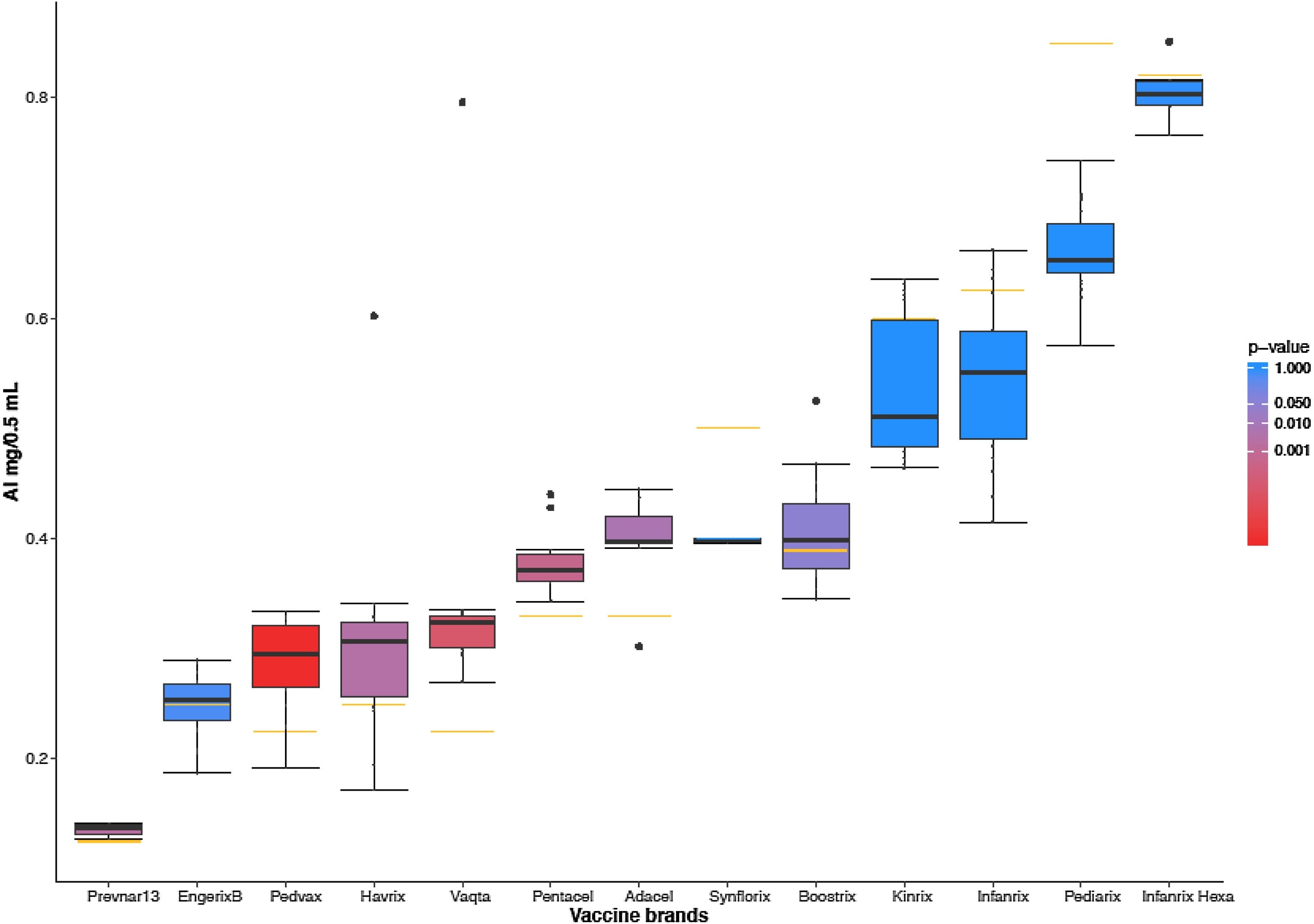 Please find the results of our measurements in Table 2 of the same paper. In Table 3 you will find a summary of our results comparing the actual amount of aluminium in a particular vaccine with the amount stated by the manufacturer in the patient information leaflet. You will see that the amount indicated by the manufacturer was only accurate (well within 10%) for 3 vaccines.