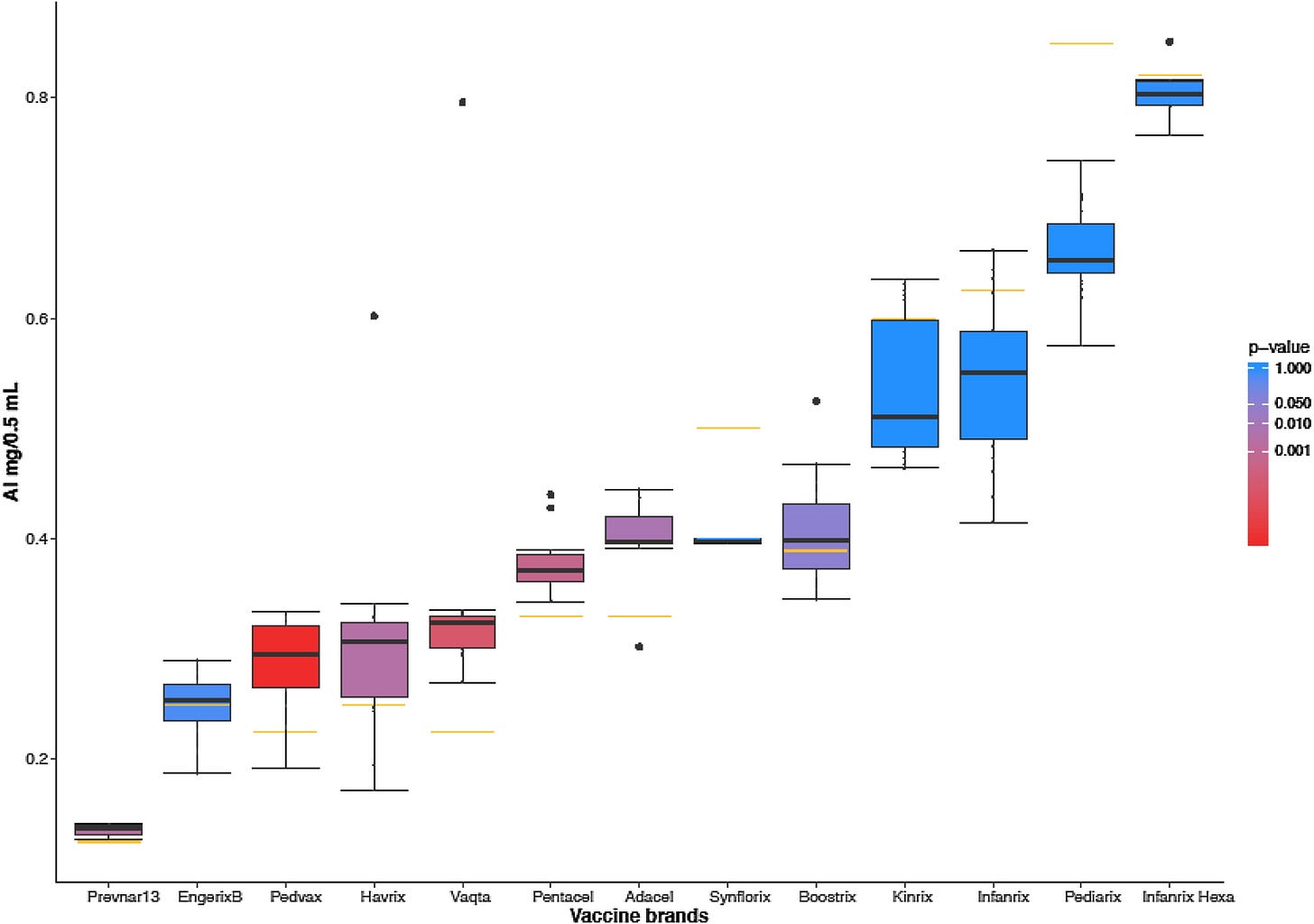 Manufacturers of vaccines that include an aluminium adjuvant are required to tell you how much aluminium is in each dose of the vaccine. Unfortunately the regulatory bodies charged with policing the content of vaccines, for example the FDA or the EMA, do not check the aluminium content of a vaccine. They accept the value given by the manufacturer. I was not prepared to accept data provided by vaccine manufacturers and so we measured the aluminium content of all the infant vaccines listed in Table 1.